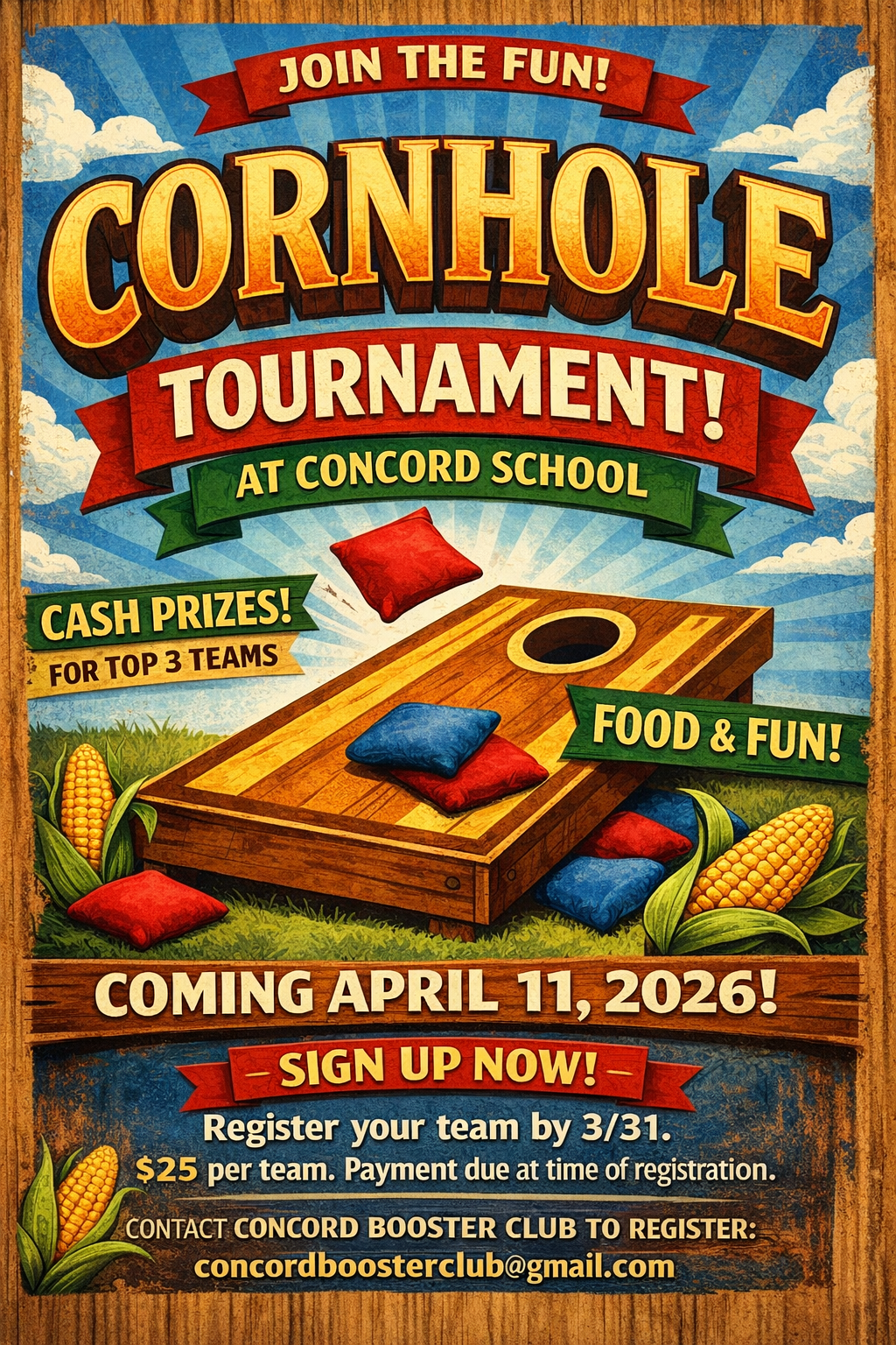 Get ready for an exciting day of friendly competition, great food, and community fun! The Concord Booster Club is hosting a Cornhole Tournament at Concord School, and everyone is invited to participate or come cheer on the teams.