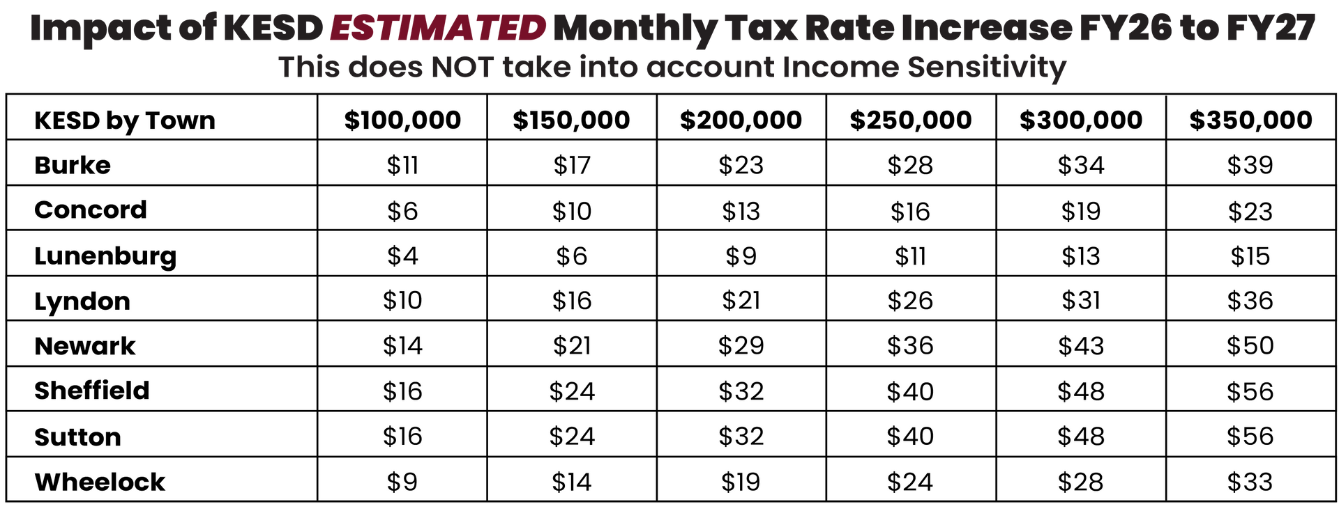 The Estimated Monthly Tax Rate Increases by town are determined based on the school district’s budgetary needs, projected expenditures, and available funding sources. School boards develop annual budgets that account for costs such as staff salaries and benefits such as health insurance, facility maintenance, transportation, and special programs. Changes in property assessments, enrollment numbers, and state funding allocations can all impact tax rate adjustments. KESD taxpayers paid 49% of the FY26 budget while the remaining 51% was funded by other towns across VT. Once the annual tax rate is established, officials estimate the monthly impact for homeowners by calculating the difference in yearly taxes under the new rate and dividing it by 12, providing a clearer picture of the additional monthly cost for residents.