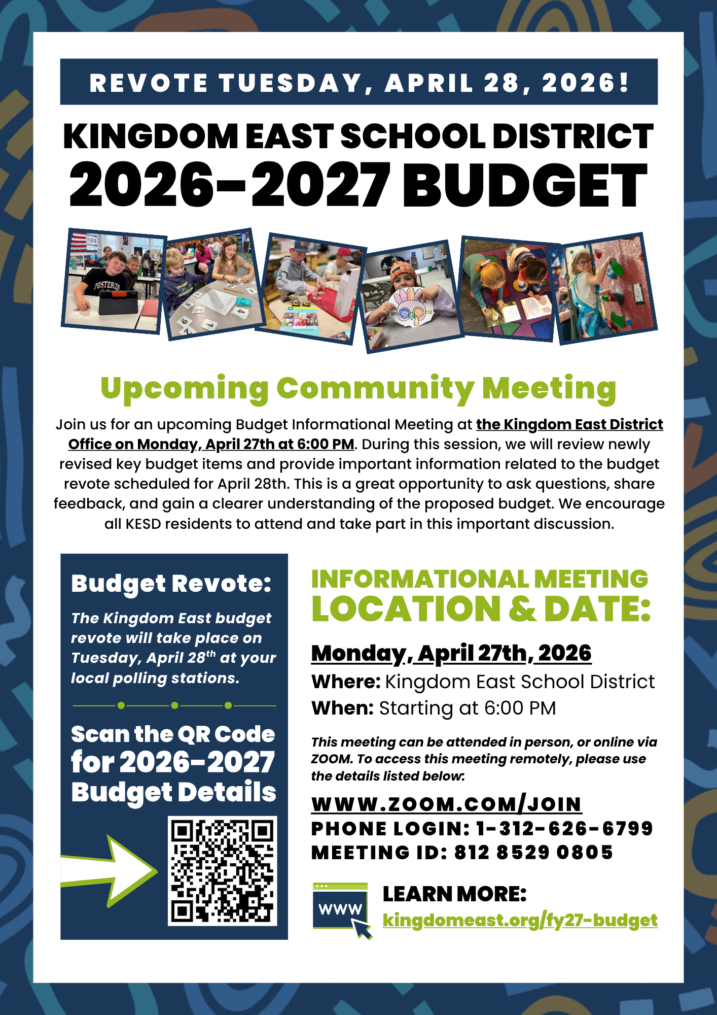 the Kingdom East District Office on Monday, April 27th at 6:00 PM. During this session, we will review newly revised key budget items and provide important information related to the budget revote scheduled for April 28th. This is a great opportunity to ask questions, share feedback, and gain a clearer understanding of the proposed budget. We encourage all KESD residents to attend and take part in this important discussion.
