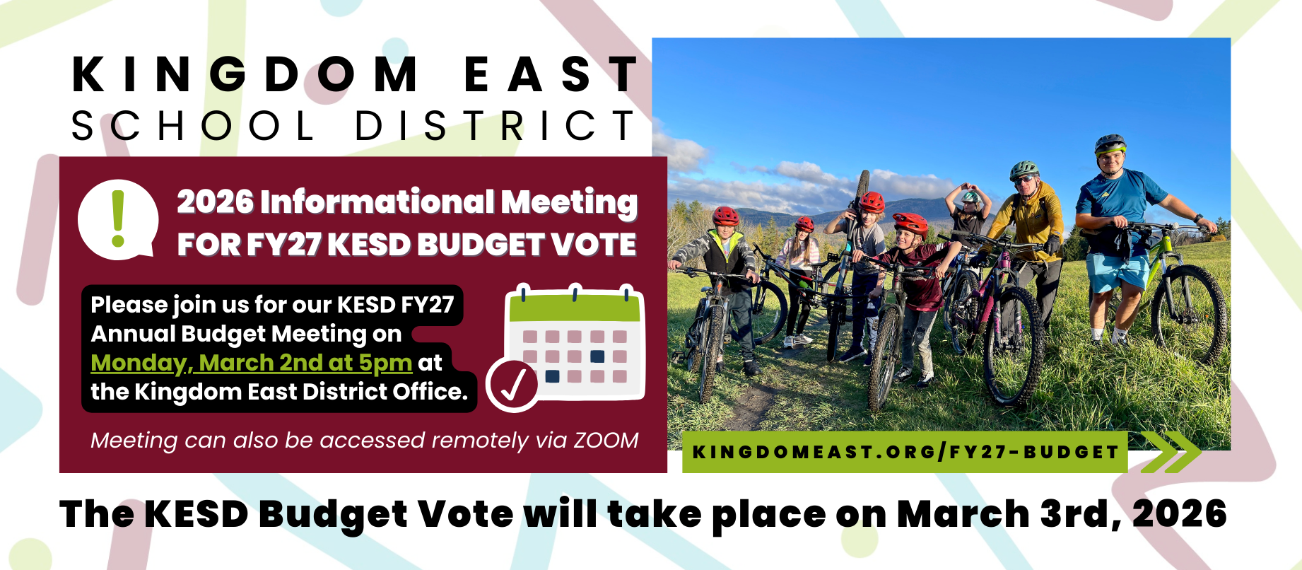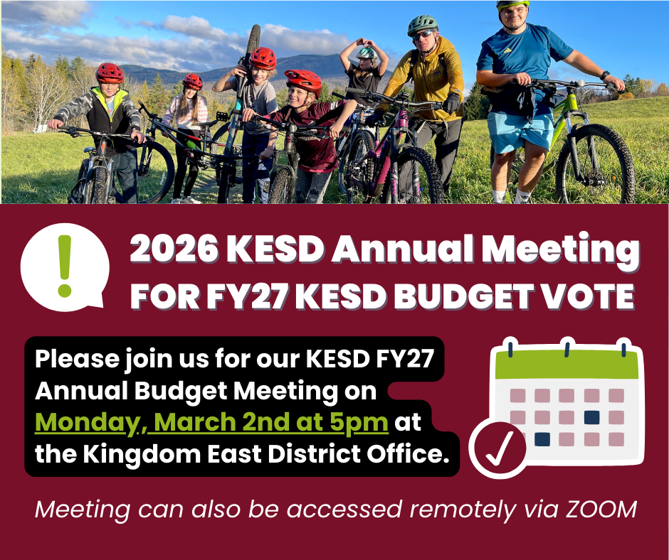 Residents of the Kingdom East Unified Union School District (the "District"), comprising the voters of the Towns of Burke, Concord, Lyndon, Lunenburg, Newark, Sheffield, Sutton, and Wheelock, who are not already on the voter checklist, may register to vote up to and including the date of the vote, March 3, 2026.